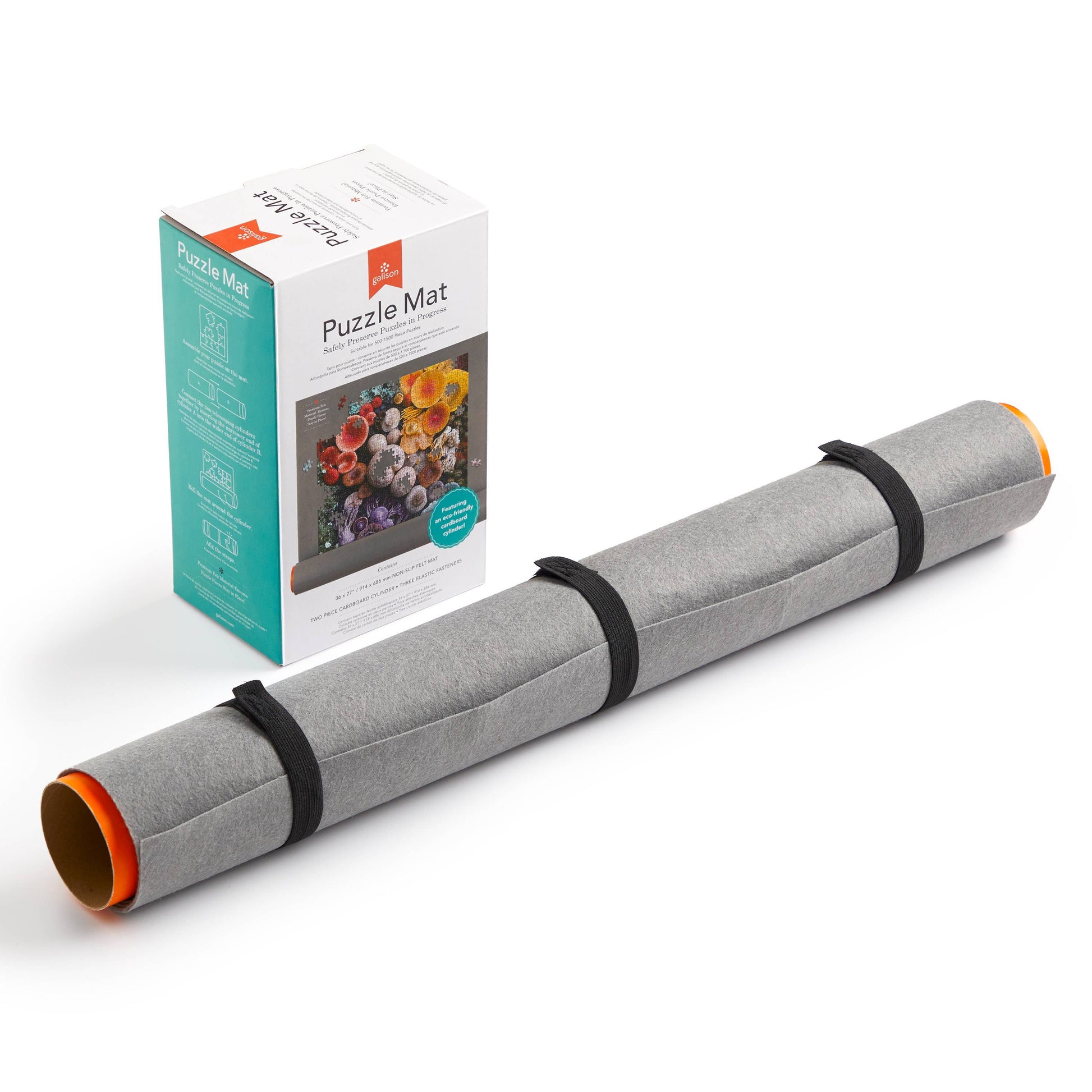 The Puzzle Mat by Galison will safely preserve your puzzles in progress. Premium felt fabric ensures your puzzle pieces stay in place so never lose a puzzle piece again! Included is a non-slip felt mat, two piece cardboard cylinder and three elastic straps.
