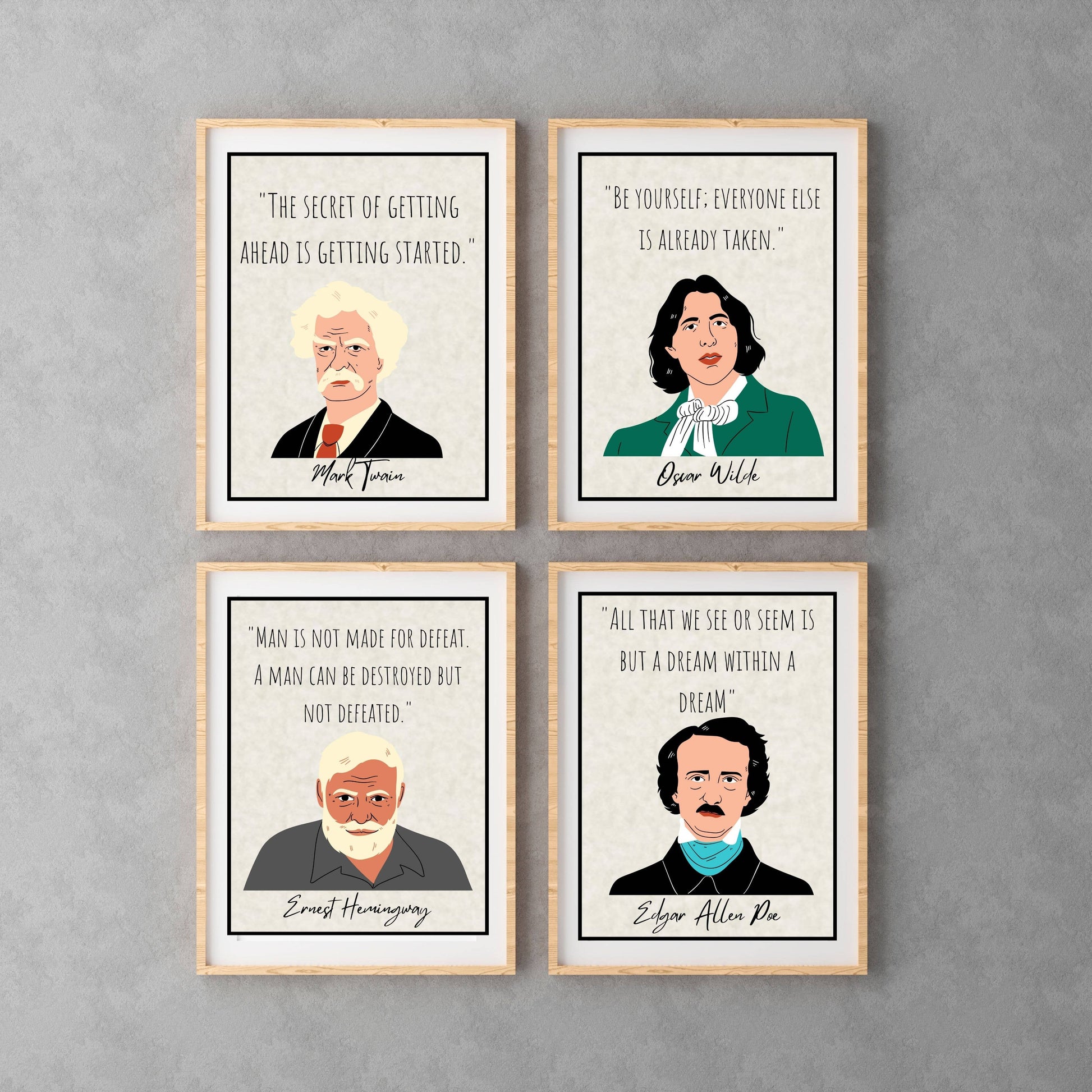 Celebrate the wisdom of iconic authors with this curated set of eight inspirational prints featuring timeless quotes. Each art print showcases a portrait and a motivational quote from literary greats such as Anne Frank, Edgar Allen Poe, Jane Austen, Mark Twain, Charles Dickens, Ernest Hemingway, Oscar Wilde, and Ayn Rand. Perfect for libraries, classrooms, bookstores, or home decor, these prints bring a touch of sophistication and encouragement to any space. Designed with a classic aesthetic to appeal to book lovers and thinkers alike, they make a thoughtful gift for teachers, readers, and aspiring writers.