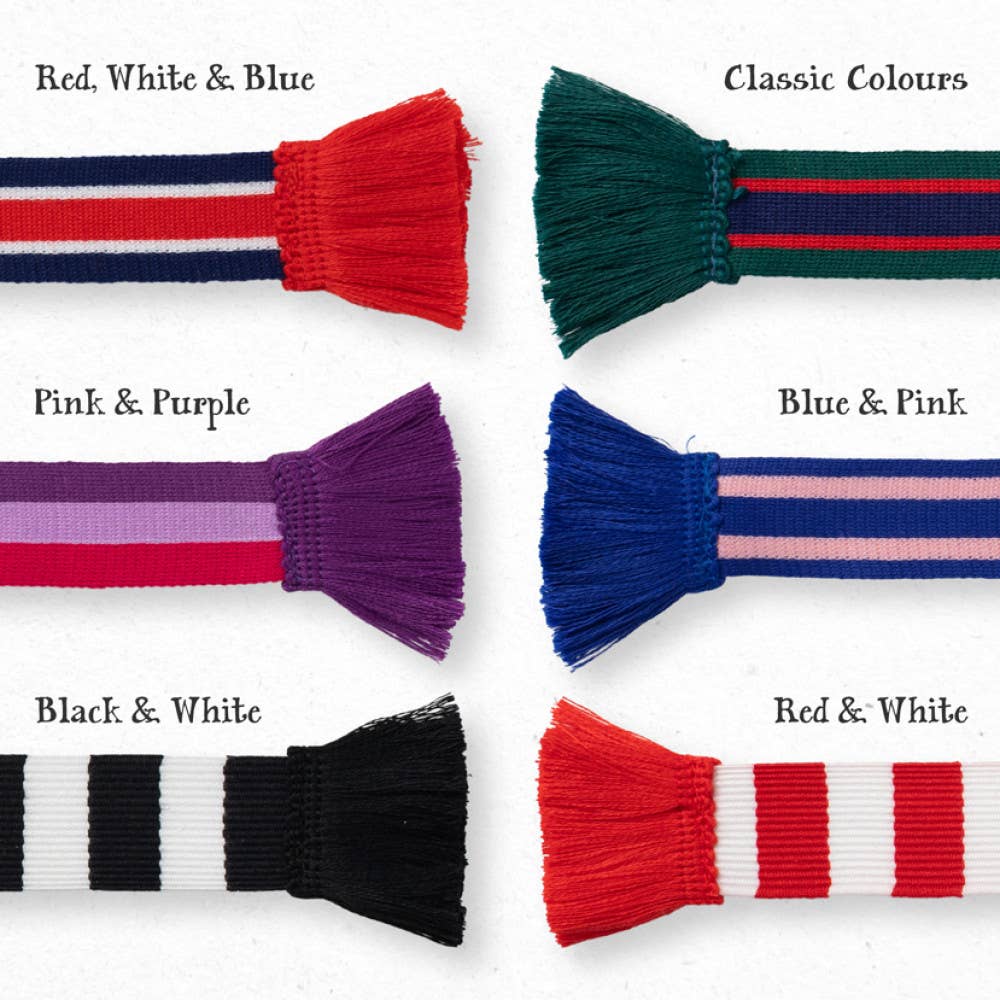 A fun and funky way to dress up your book. 38cm long woven scarf including matching fringe. Long enough to flop through most books - even bigger ones!
