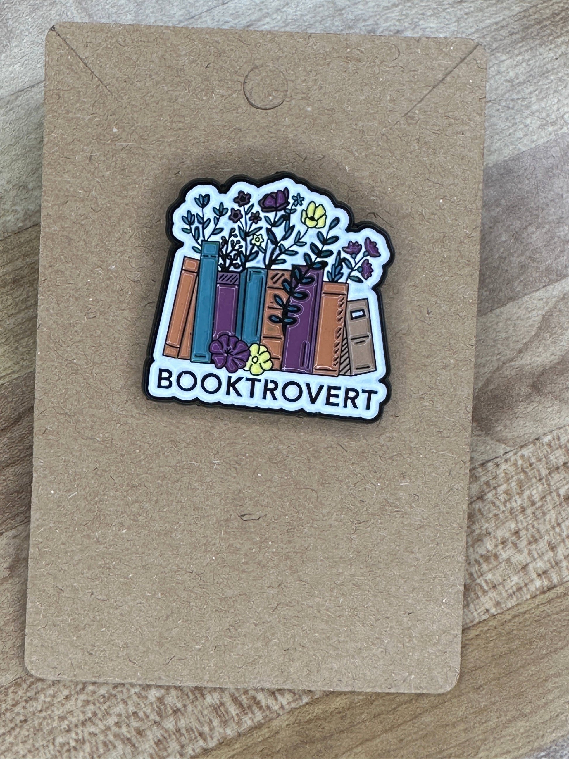 Booktrovert enamel pin with flower.