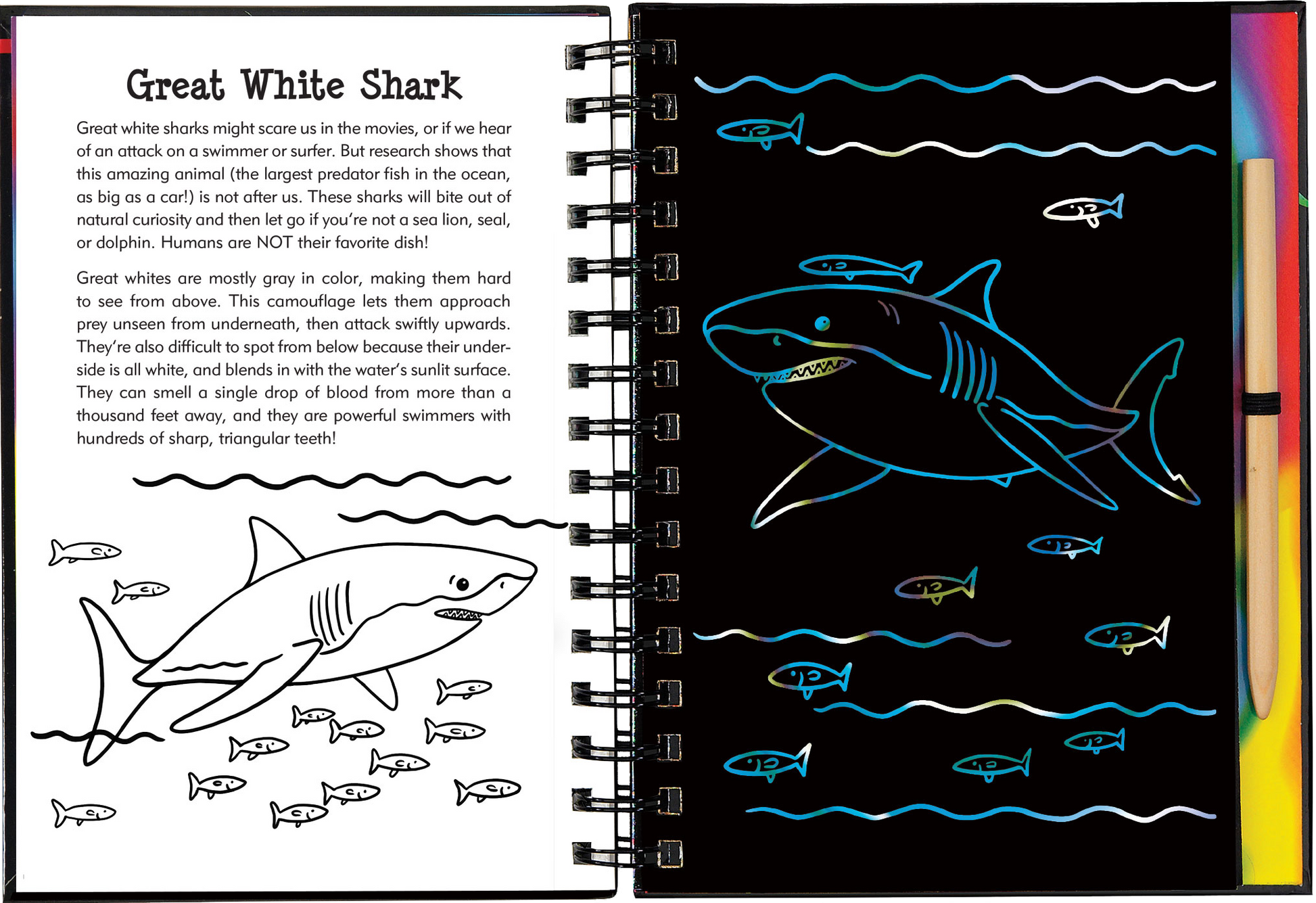 Scratch and sketch your way through the mysterious undersea world of sharks! Learn about great white sharks, blue sharks, thresher sharks, and many more! This is a Trace-Along Scratch and Sketch ! Use the wooden stylus included to trace the white outlines on the black-coated pages and reveal the glittery foil and rainbow-swirl colors beneath! Makes a fun way for young children (5 and up) to build confidence in their creativity. They can also use the extra sketch pages in the back to draw their own shark pictures. Book contains 20 black-coated scratch-off pages, 20 illustrated pages with informative text, and 20 extra pages for independent drawing and sketching. The wooden stylus is shrink-wrapped with the book. Suggested ages: 5 and up. Sturdy wire-o hardcover binding. Art activity book measures 6-3/8'' wide x 8-1/2'' high.