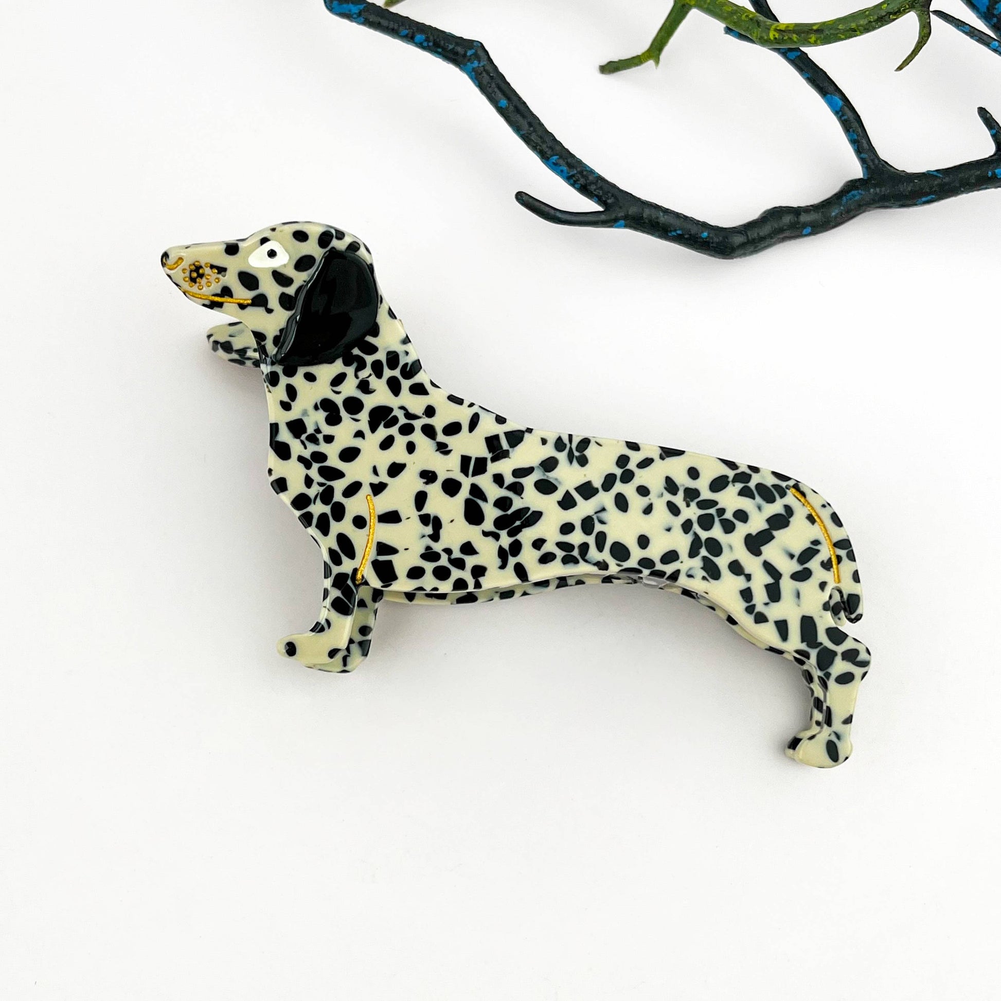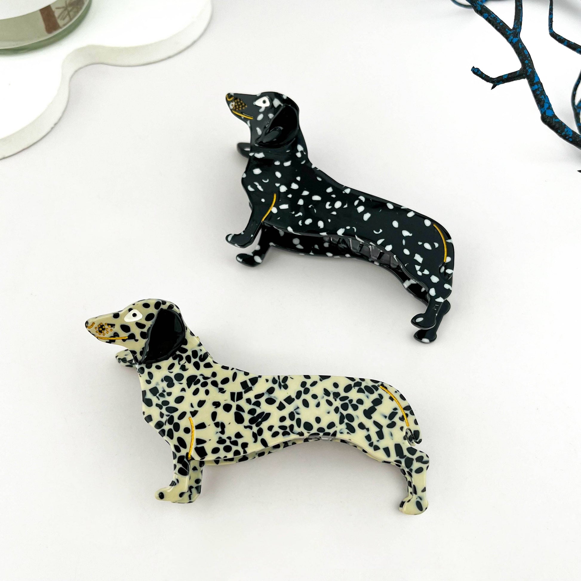 Add a touch of charm and playfulness to your hairstyle with this dachshund-inspired acetate hair claw. Designed for dog lovers, this adorable accessory features a clever and mischievous dachshund silhouette, crafted from high-quality, eco-friendly acetate. Its sturdy claw grip ensures a secure hold, making it perfect for all hair types. Whether you're styling a casual or chic look, this unique hair claw brings personality and fun to your everyday outfits.