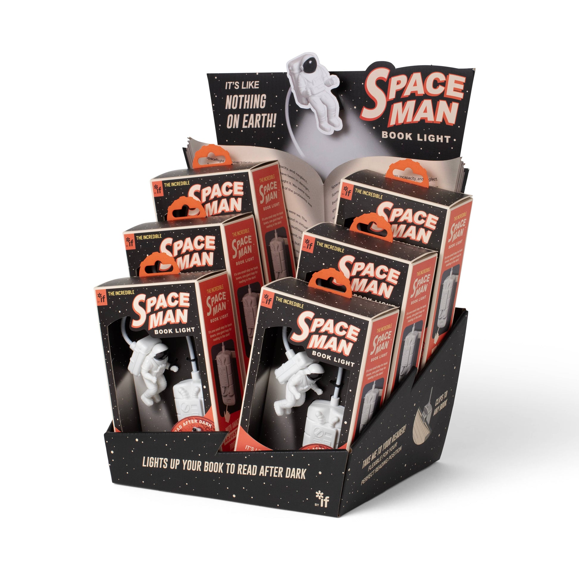 In a really cool retro style all-cardboard display box with moulded 'planet' shaped hook and available with an out of this world counter top display. One small step for book lovers - one giant leap for reading in the dark!