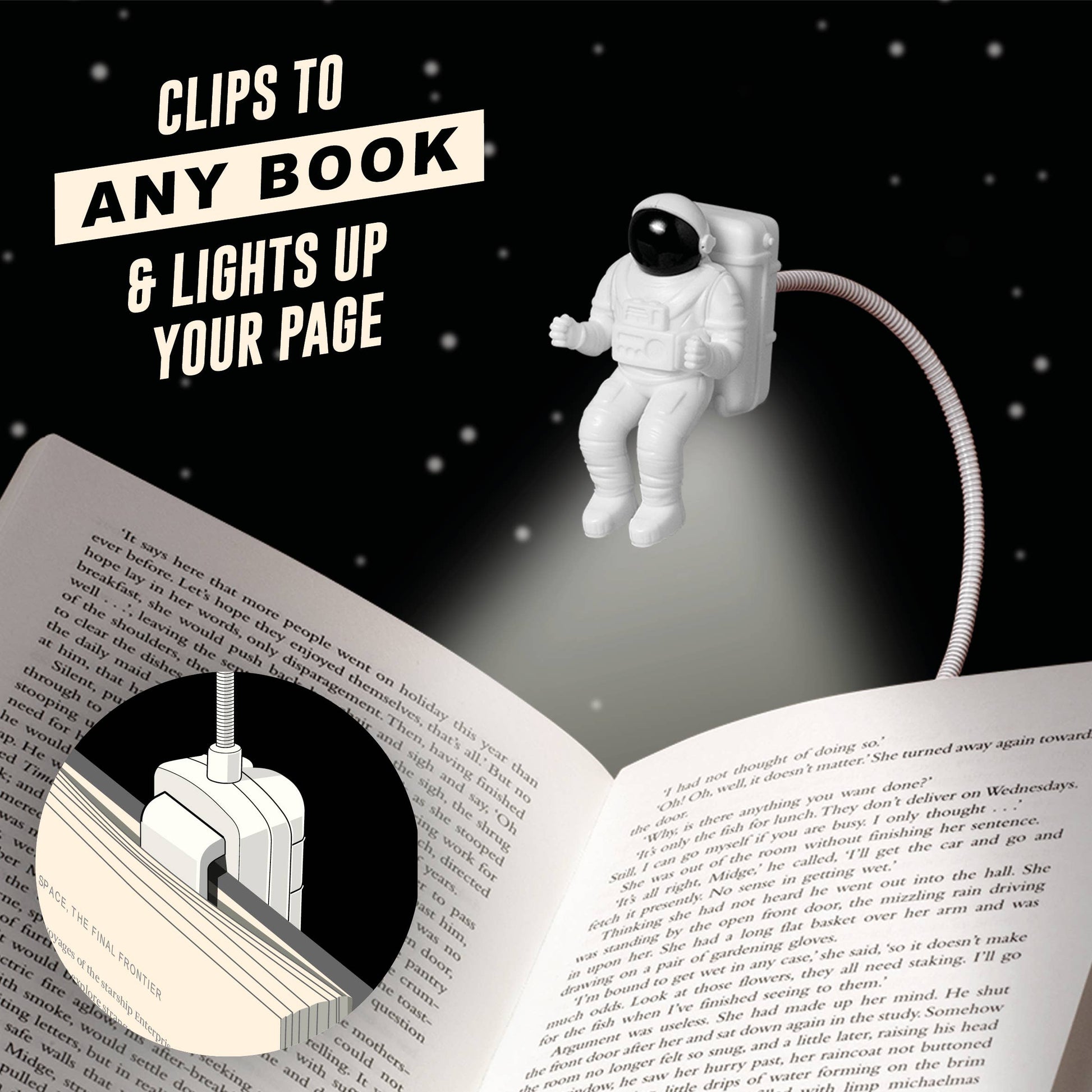 Desired by retro loving readers and space geeks of any age, this 3D astronaut casts a twin LED light beam onto your book. And fuelled by 3 x AAA batteries for a longer life, this light won't leave you out in the dark. Clip the 'base control' unit safely onto your book, adjust the brightness level and move the bendy 'air hose' to create the right reading atmosphere for you!